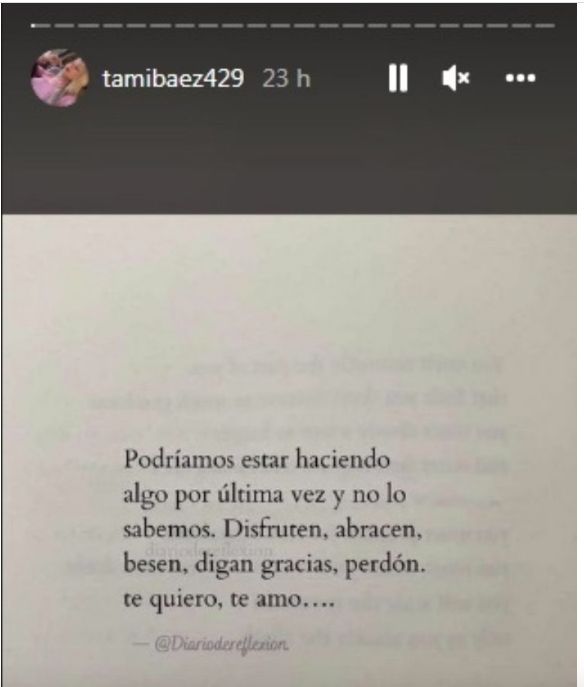 A través de sus stories, Tamara reposteó una frase muy emotiva que reza: "Podríamos estar haciendo algo por última vez y no lo sabemos. Disfruten, abracen, besen, digan gracias, perdón, te quiero, te amo". En clara referencia al valor del presente, del aquí y ahora.