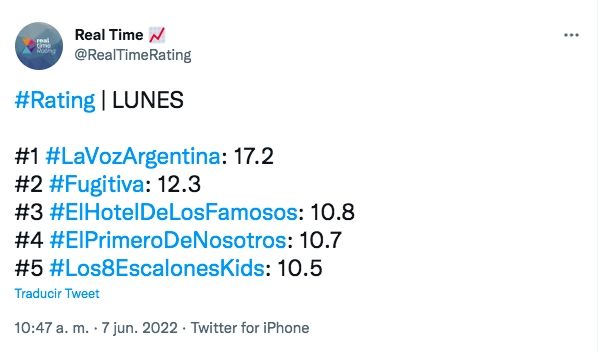 Previamente, Fugitiva (Telefe) había alcanzado los 12.3 puntos de rating y más tarde, El primero de nosotros logró 10.7 puntos. Por su parte, en El Trece lo mejor pasó por El hotel de los famosos que registró 10.8 puntos de rating y le siguió Los 8 escalones del millón que se mantuvo con 10.5 puntos.