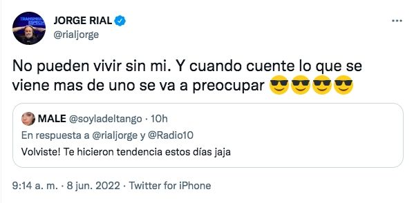 Fue en Twitter, donde Rial anunció su regreso al aire con "Argenzuela" (Radio 10). "¡Volviste! Te hicieron tendencia estos días jaja", le comentó una seguidora. "No pueden vivir sin mí. Y cuando cuente lo que se viene más de uno se va a preocupar", respondió contundente el conductor.