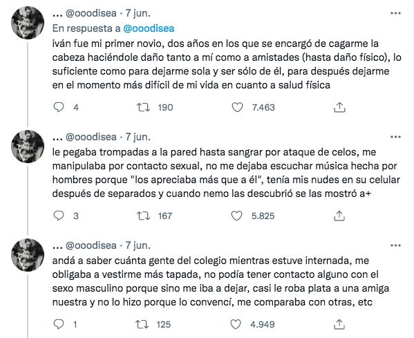 Luego, agregó: "Iván fue mi primer novio, dos años en los que se encargó de cagarme la cabeza haciéndole daño tanto a mí como a amistades (hasta daño físico), lo suficiente como para dejarme sola y ser sólo de él, para después dejarme en el momento más difícil de mi vida en cuanto a salud física".