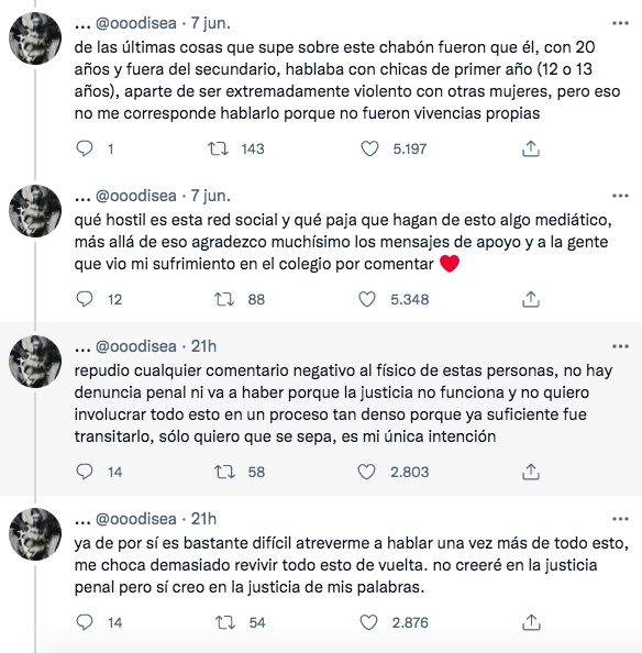 "De las últimas cosas que supe sobre este chabón fueron que él, con 20 años y fuera del secundario, hablaba con chicas de primer año (12 o 13 años), aparte de ser extremadamente violento con otras mujeres, pero eso no me corresponde hablarlo porque no fueron vivencias propias", agregó.