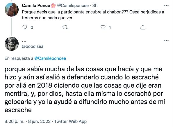Además, la participante también quedó involucrada en el descargo: "(Daiana) sabía mucha de las cosas que hacía y que me hizo y aún así salió a defenderlo cuando lo escraché por allá en 2018 diciendo que las cosas que dije eran mentira, y, por dios, hasta ella misma lo escrachó por golpearla y yo la ayudé a difundirlo mucho antes de mi escrache, reveló.