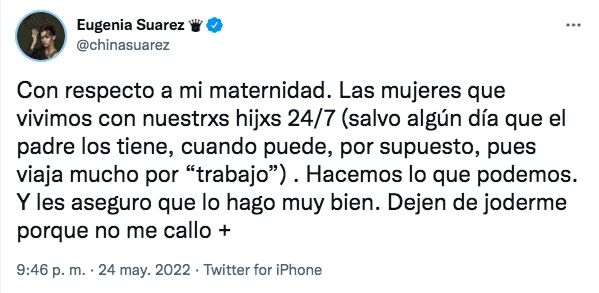 "Con respecto a mi maternidad. Las mujeres que vivimos con nuestrxs hijxs 24/7 (salvo algún día que el padre los tiene, cuando puede, por supuesto, pues viaja mucho por “trabajo”) hacemos lo que podemos. Y les aseguro que lo hago muy bien. Dejen de joderme porque no me callo", sostuvo La China en aquel posteo.