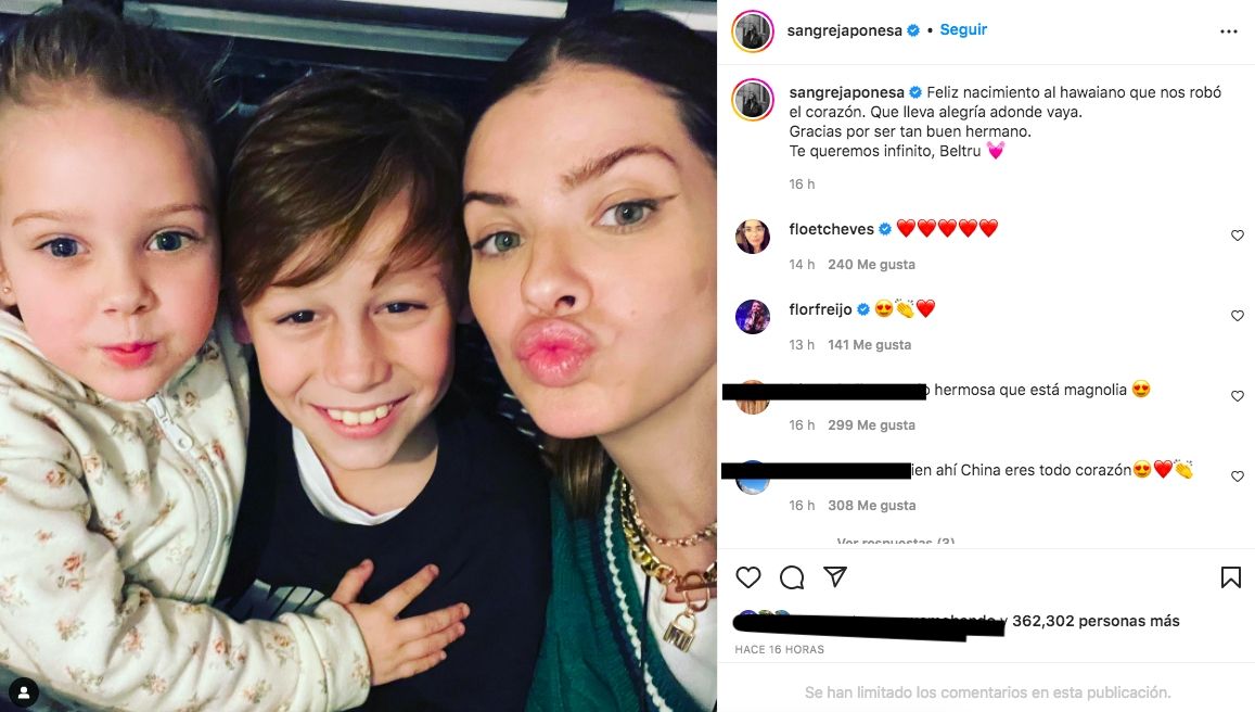 Recientemente, la actriz publicó una emotiva foto junto a su hija Magnolia y el pequeño Beltrán, que acaba de cumplir 10 años. "Feliz nacimiento al hawaiano que nos robó el corazón. Que lleva alegría adonde vaya. Gracias por ser tan buen hermano. Te queremos infinito, Beltru", expresó.