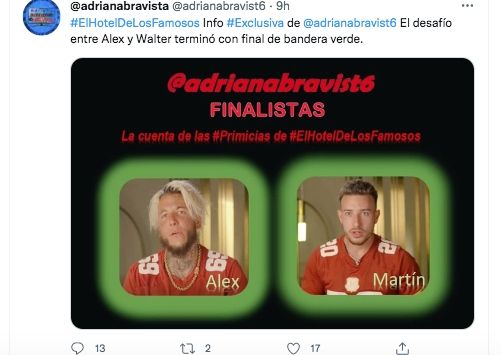 Según este usuario de redes sociales, la definición del título y del premio económico de diez millones de pesos se desarrollará entre Alex Caniggia y Martín Salwe. Una primicia explosiva, que se enmarca en la tendencia de la imposición de personalidades polémicas, resonantes y controversiales.