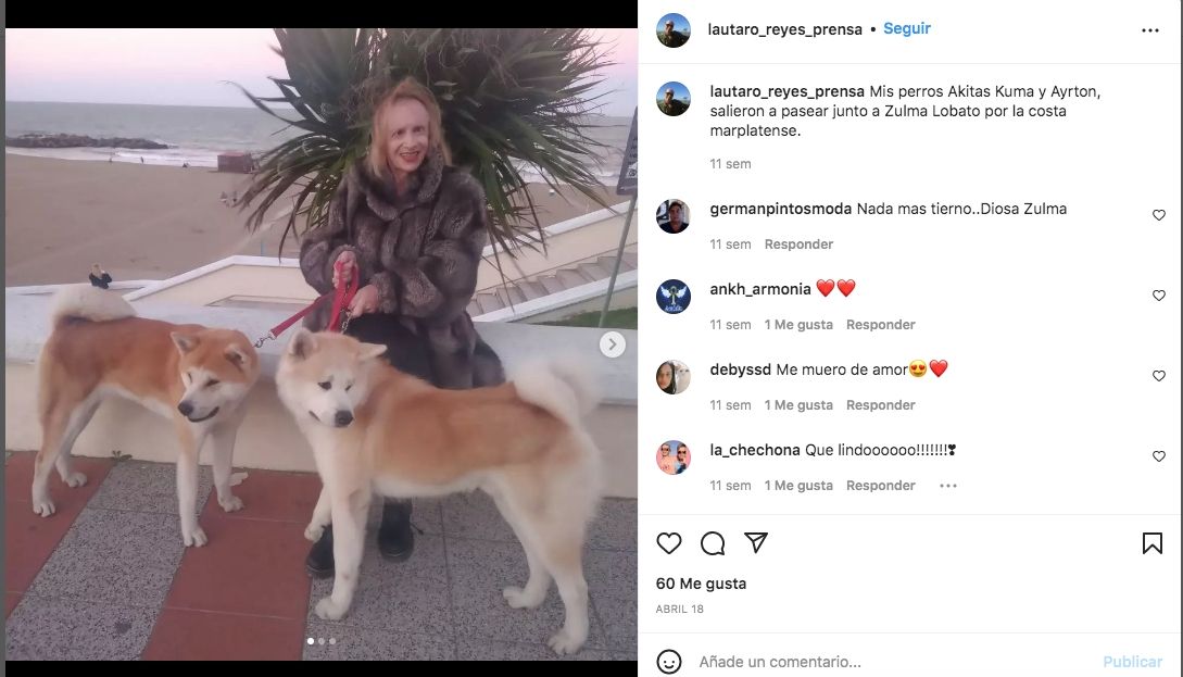 Hace unas semanas, Reyes posteó en su cuenta de Instagram unas fotos de Zulma de paseo por la costanera, esa interminable y hermosa vía al lado del mar, donde luce junto a dos perros. Así, Lautaro contó lo que sucedió esa tarde: “Mis perros Akitas Kuma y Ayrton, salieron a pasear junto a Zulma Lobato por la costa marplatense”.