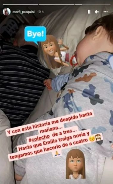 En una foto mostró cómo duermen los tres en la cama, el famoso colecho. Sin embargo, una humorada fue tomada para la polémica. "Y con esta historia me despido hasta mañana", escribió. "Colecho de a tres. Hasta que Emilio traiga novia y tengamos que hacerlo de a cuatro", agregó.
