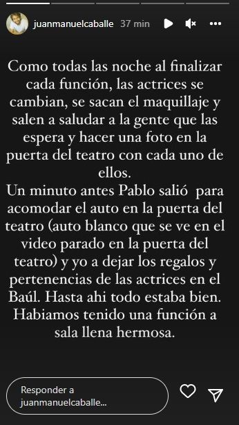 Y continuó: "Un minuto antes, Pablo salió para acomodar el auto en la puerta del teatro (auto blanco que se ve en el video parado en la puerta del teatro) y yo a dejar los regalos y pertenencias de las actrices en el baúl. Hasta ahí estaba todo bien. Habíamos tenido una función a sala llena hermosa".