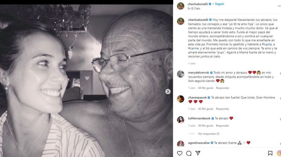 Aunque en esa misma publicación, Chechu reconoció: "Se que el tiempo ayudará a sanar todo esto. Fuiste el mejor papá del mundo entero, acompañándome a sol y sombra en cualquier parte del mundo. Me quedo con todo lo que me enseñaste en esta vida pa. Prometo honrar tu apellido y hablarle a #lupita, a #carme, y al bb que está en camino de vos siempre. Te amo y te amaré eternamente 'pupi'. Agarrá a Mamá fuerte de la mano y recorran juntos el cielo".