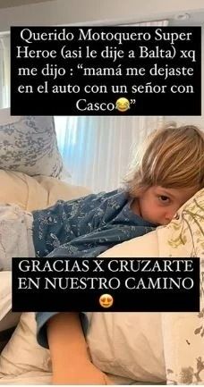 "Querido motoquero súperhéroe (así le dije a Balta) porque me dijo ‘mamá, me dejaste en el auto con un señor con casco’. Gracias por cruzarte en nuestro camino. Comparto esto porque si yo hubiese sabido y leído de la convulsión febril, tal vez no me desesperaba tanto", escribió.