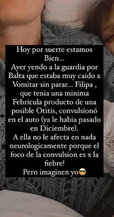 Fue mediante su cuenta de Instagram que la espsoa de Pedro Alfonso decidió compartir mediante sus stories el desesperante momento y realizó un pedido: "Hoy por suerte estamos bien, ayer yendo a la guardia por Baltazar que estaba muy caído por vomitar sin parar, Filipa, que tenía una mínima febrícula producto de una posible otitis, convulsionó".