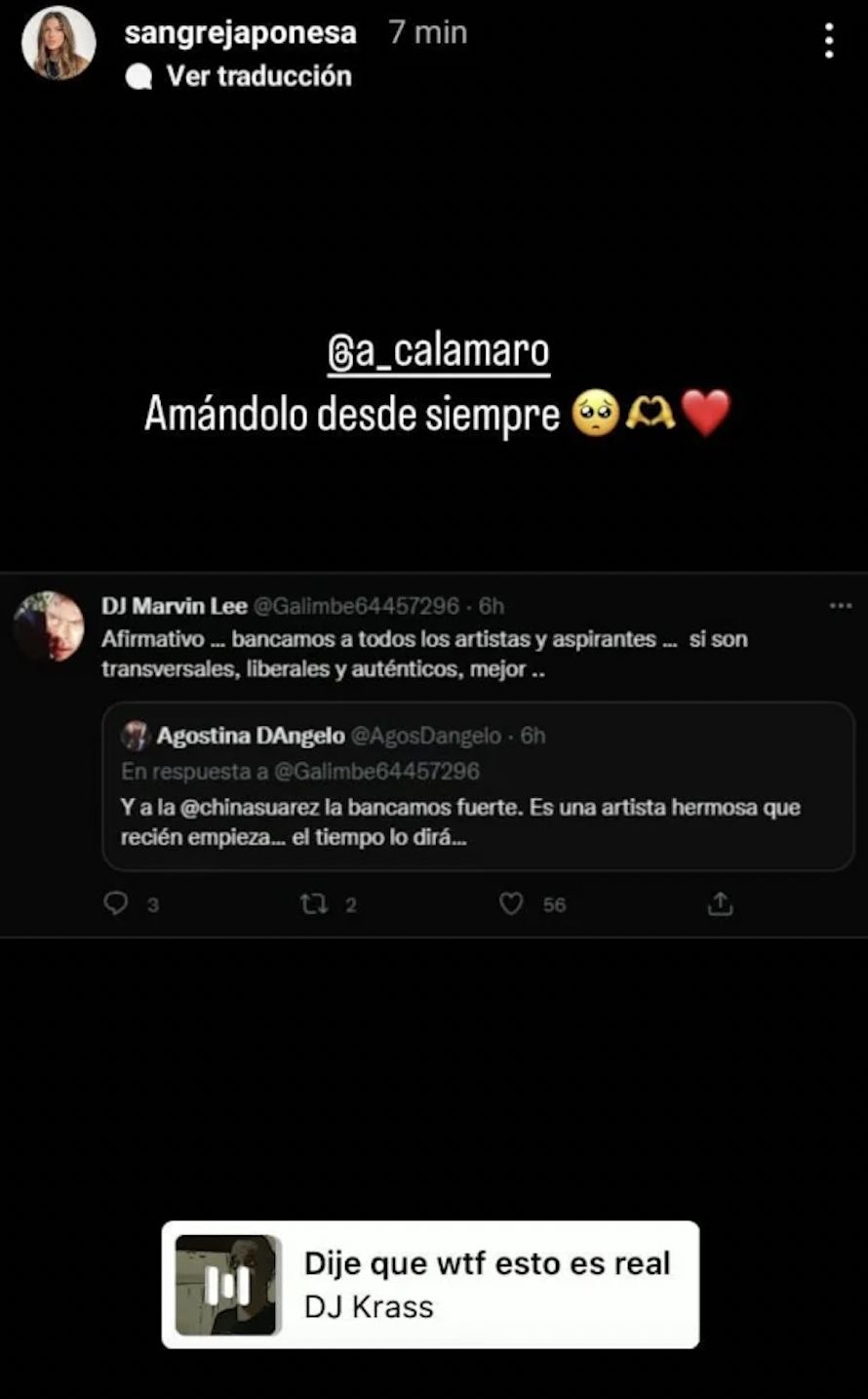 "Afirmativo, bancamos a todos los artistas y aspirantes, si son transversales, liberales y auténticos, mejor”, expresó Andrés Calamaro ante ese comentario y la actriz decidió enviarle un mensaje por medio de sus historias de Instagram: "Amándolo desde siempre”.