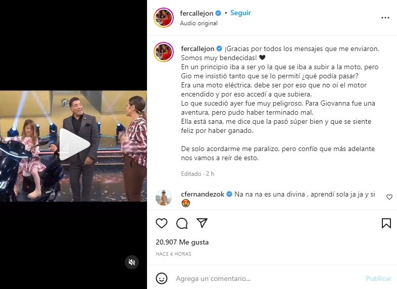"¡Gracias por todos los mensajes que me enviaron! ¡Somos muy bendecidas! En un principio iba a ser yo la que se iba a subir a la moto, pero Gio me insistió tanto que se lo permití. ¿Qué podía pasar? Era una moto eléctrica, debe ser por eso que no oí el motor y por eso accedía a que subiera", comenzó explicando la actriz.