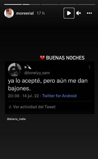 Ahora, en las últimas horas, Morena volvió a referirse al tema. En sus historias de Instagram compartió un mensaje donde expresa: "Ya lo acepté, pero aún me dan bajones".