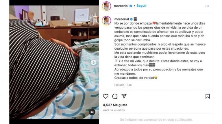 La influencer había compartido con sus seguidores un video, en el que se veía como se movía su panza, y una foto de una ecografía que se había hecho recientemente. "Son momentos complicados, y pido el respeto que se merece cualquier persona que pasa por estas situaciones. Me está costando muchísimo poder levantarme de esta, pero la vida tiene que continuar".