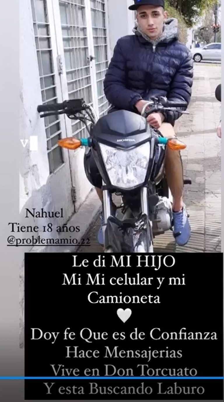 Ahora, finalmente el hombre en cuestión apareció. Tras dos días de búsqueda, Paula Chaves compartió la imagen del joven de 18 años que se convirtió en su gran salvador en un momento de total terror. "Nahuel. Tiene 18 años. Le di a mi hijo, mi celular y mi camioneta. Doy fe que es de confianza. Hace mensajerías. Vive en Don Torcuato. Gracias por cruzarte en nuestro camino Nahu”, escribió agradecida junto a la postal.
