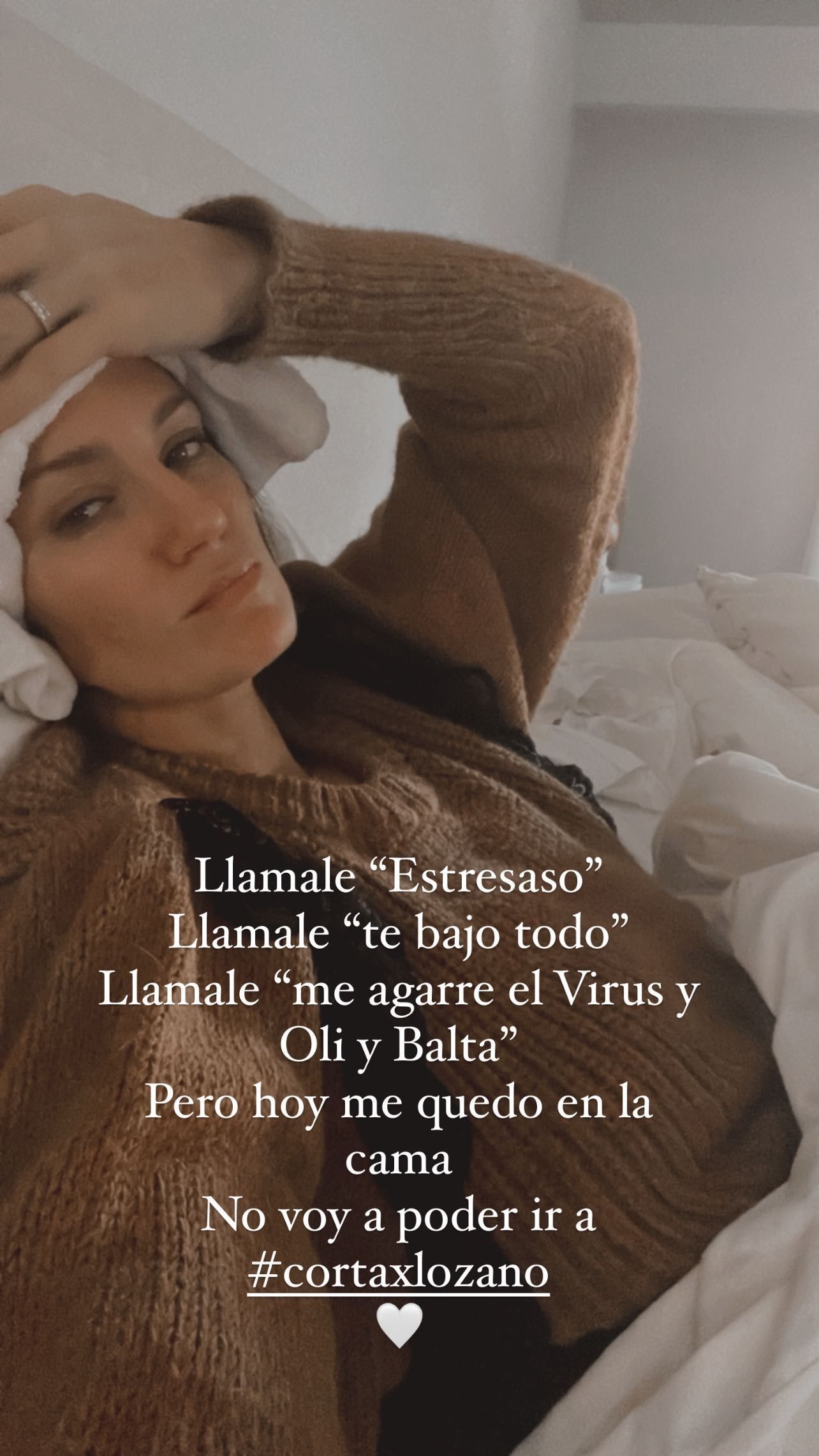 "Llamale 'estresado' llamale 'te bajo todo' llamale 'me agarre el virus y Oli y Balta' pero hoy me quedo en la cama", escribió Paula en una de sus historias de Instagram en la que se la puede ver recostada y con un paño en su frente.