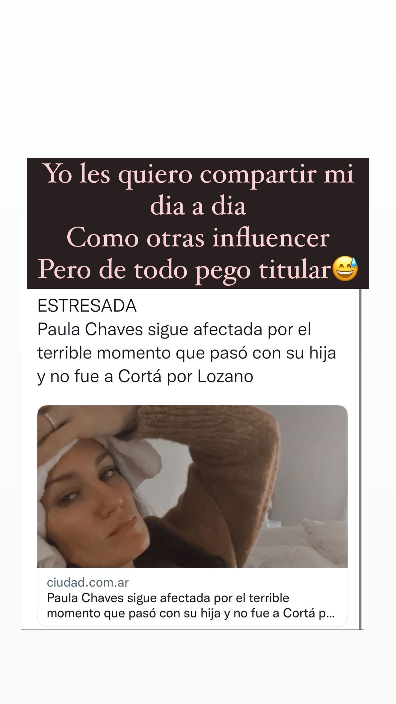 Más allá de la actual instancia de salud que atraviesa Chaves, la modelo se permitió bromear con los títulos de algunos portales de espectáculos sobre la hipótesis de que su cuadro es una consecuencia del urgente momento familiar que tuvo con sus niños.