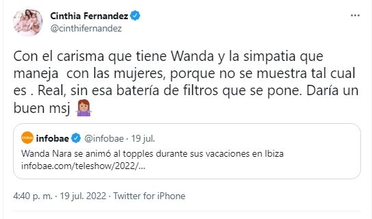 "Wanda Nara se animó al topless durante sus vacaciones en Ibiza", decía el título de la nota de Infobae que reposteó la panelista en su cuenta de Twitter. Luego, comentó: "Con el carisma que tiene Wanda y la simpatía que maneja con las mujeres, porque no se muestra tal cuál es. Real, sin esa batería de filtros que se pone. Daría un buen mensaje".