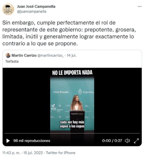 Junto a su opinión, sumó el video en donde se le consultaba a la vocera presidencial sobre la "vulnerabilidad de los derechos constitucionales de los ciudadanos argentinos" como producto de las nuevas medidas económicas implementadas por el Gobierno.