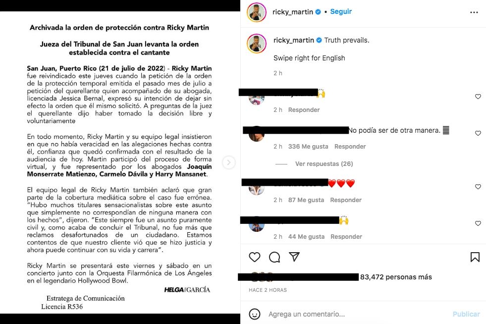 Además, el abogado Marcos Rivera explicó a Efe que esa primera orden de restricción que pesaba sobre el cantante se expidió de forma "provisional". "La expidieron provisionalmente, hasta que no escuchen a Ricky Martin la orden no se convierte en permanente por el tiempo que determine el tribunal", indicó el letrado.