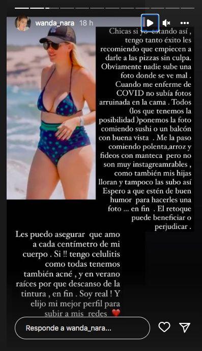 Tras las repercusiones que se generaron, Wanda decidió compartir una contundente reflexión al respecto. "Chicas, si yo estando así tengo tanto éxito, les recomiendo que empiecen a darle a las pizzas sin culpa", comenzó expresando en sus historias de Instagram.