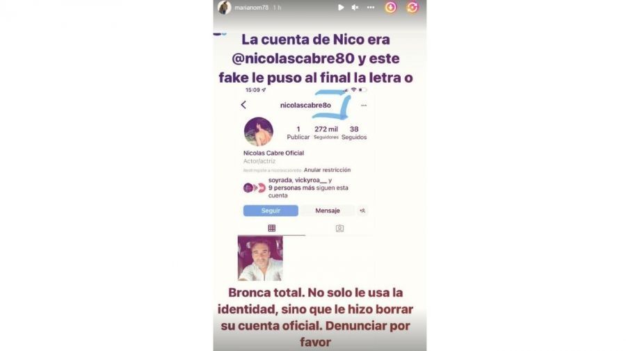 Además, el internauta tomó el nombre de Cabré, le cambió una letra por un número y lo dejó fuera de Instagram, situación que Mariano Martínez denunció explicando en sus historias de Instagram. "La cuenta de Nico era @nicolascabre80 y este fake le puso al final la letra O", explicó.