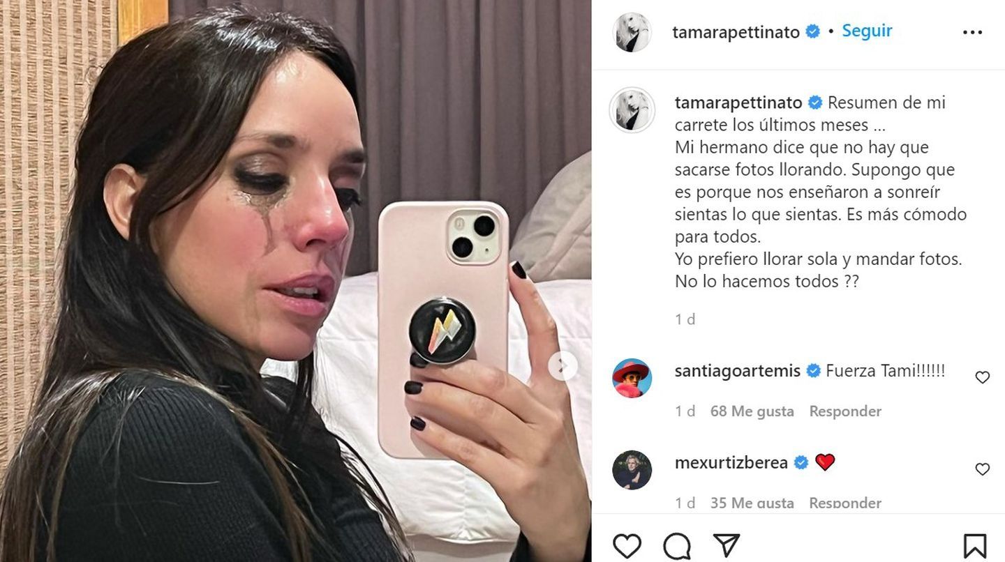 “Resumen de mi carrete los últimos meses. Mi hermano dice que no hay que sacarse fotos llorando... Supongo que es porque nos enseñaron a sonreír, sientas lo que sientas. Es más cómodo para todos... Yo prefiero llorar sola y mandar fotos. ¿No lo hacemos todos?”, expresó Tamara Pettinato aludiendo en su epígrafe a su hermano Felipe.