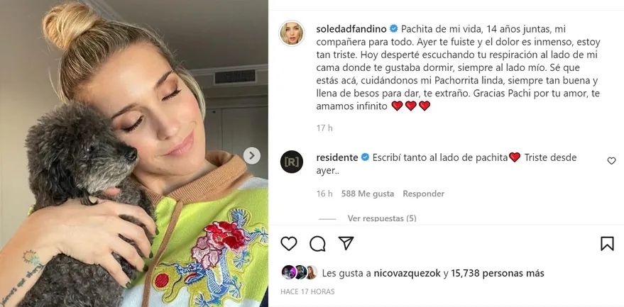 Luego siguió: “Hoy desperté y escuché tu respiración al lado de mi cama, donde te gustaba dormir, siempre al lado mío. Sé que estás acá, cuidando de nosotros, mi Pachorrita linda. Siempre tan buena y llena de besos para dar. Te extraño. Gracias, Pachi, por tu amor. Te amamos infinito”.