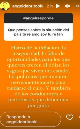 Todo comenzó cuando el periodista fue consultado por uno de sus seguidores sobre qué pensaba sobre la crisis que transita la Argentina. "Harto de la inflación, la inseguridad, la falta de oportunidades para los que quieren crecer, el dólar, los vagos que viven del Estado", contestó sin pelos en la lengua.