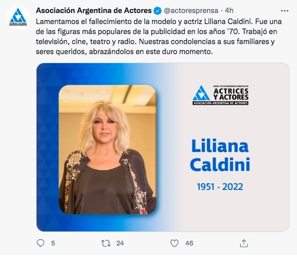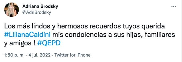 Por su parte, Adriana Brodsky también le dedicó un emotivo mensaje: "Los más lindos y hermosos recuerdos tuyos querida #LilianaCaldini. Mis condolencias a sus hijas, familiares y amigos #QEPD".