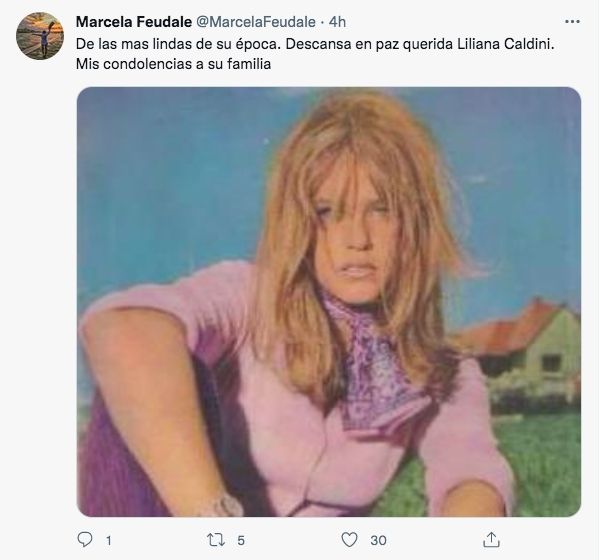 Marcela Feudale también la homenajeó al publicar una foto de cuando era modelo y escribió unas emotivas palabras: "De las más lindas de su época. Descansa en paz, querida Liliana Caldini. Mis condolencias a su familia".
