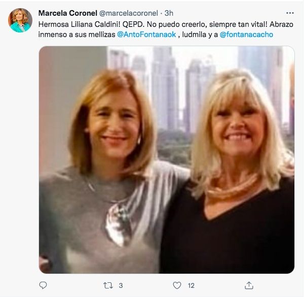 La periodista Marcela Coronel compartió con sus seguidores de Twitter una foto con Caldini y expresó: "¡Hermosa Liliana Caldini! QEPD. No puedo creerlo, siempre tan vital! Abrazo inmenso a sus mellizas @AntoFontanaok, ludmila y a @fontanacacho".