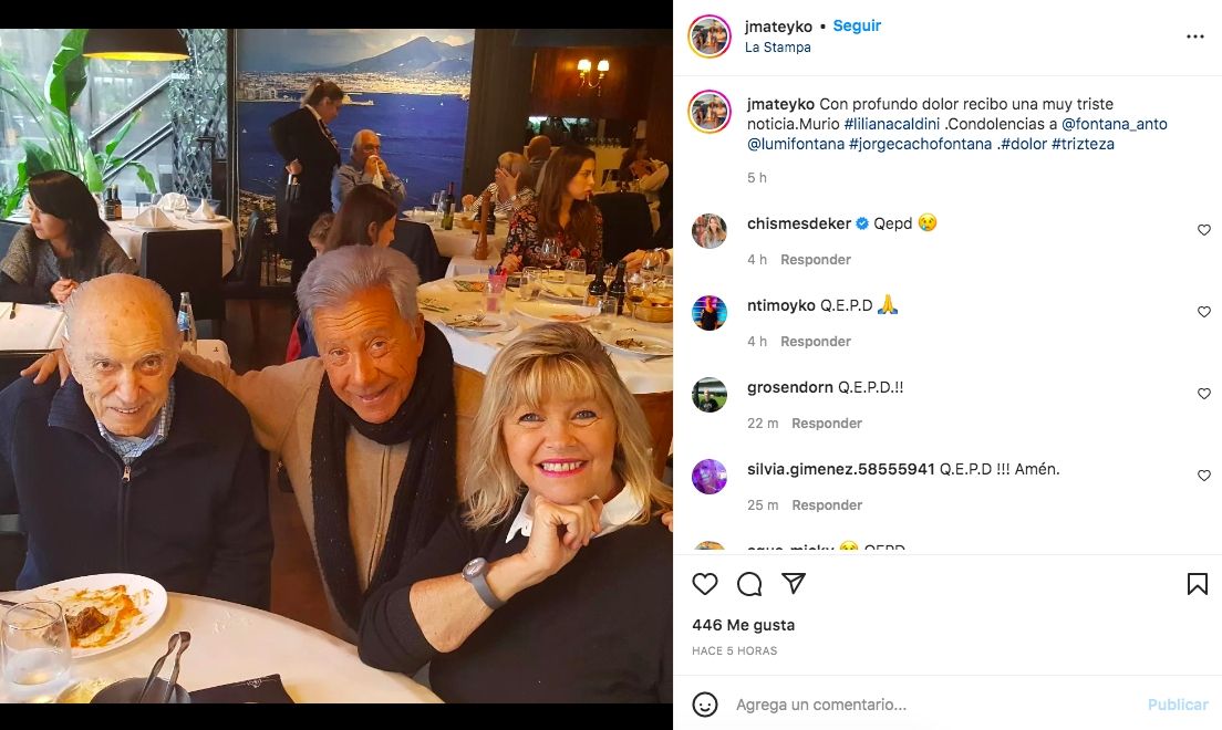 Además, el conductor Juan Alberto Mateyko posteó en su cuenta de Instagram una fotografía junto a Cacho y Liliana. "Con profundo dolor recibo una muy triste noticia. Murió #lilianacaldini .Condolencias a @fontana_anto @lumifontana #jorgecachofontana .#dolor #tristeza".