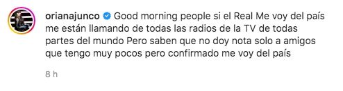 Tras la sorpresa que generó en sus miles de seguidores, la Junco volvió a utilizar su perfil: "Good morning, people. Sí, es real, me voy del país. Me están llamando de todas las radios, de la TV, de todas partes del mundo, pero saben que no doy nota, solo a amigos que tengo muy pocos, pero confirmado: me voy del país", aclaró.