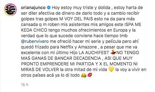 "Hoy estoy muy triste y dolida, estoy harta de ser dealer afectiva de dinero, de darlo todo y a cambio recibir golpes tras golpes. ME VOY DEL PAIS, esto no da para más", comenzó expresando la actriz en su cuenta de Instagram. "Cansada de que me roben mis asistentes, mis amigos. Este ISPA ME KEDA CHICO (sic)", agregó furiosa.