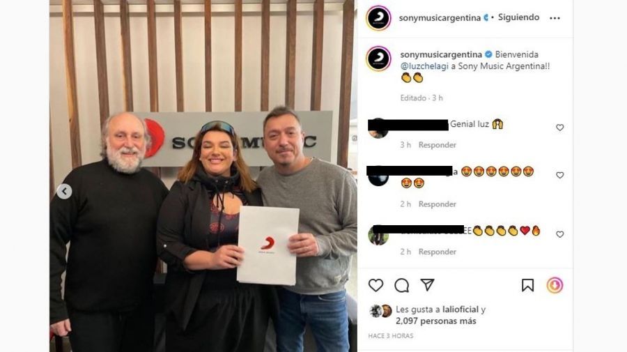 A su vez, desde la cuenta oficial de Sony Music, se la ve posar en posteo a Luz Gaggi junto a Damián Amato, líder de la discográfica, y el productor Daniel Grinbank. "Bienvenida @luzchelagi a Sony Music Argentina!!", expresaron desde la empresa. Entre los miles de "me gusta" que recibió la publicación se destaca el de Lali Espósito, quien no fue coach de la joven en La Voz Argentina, pero igualmente se alegra por el gran paso de la ascendente cantante.