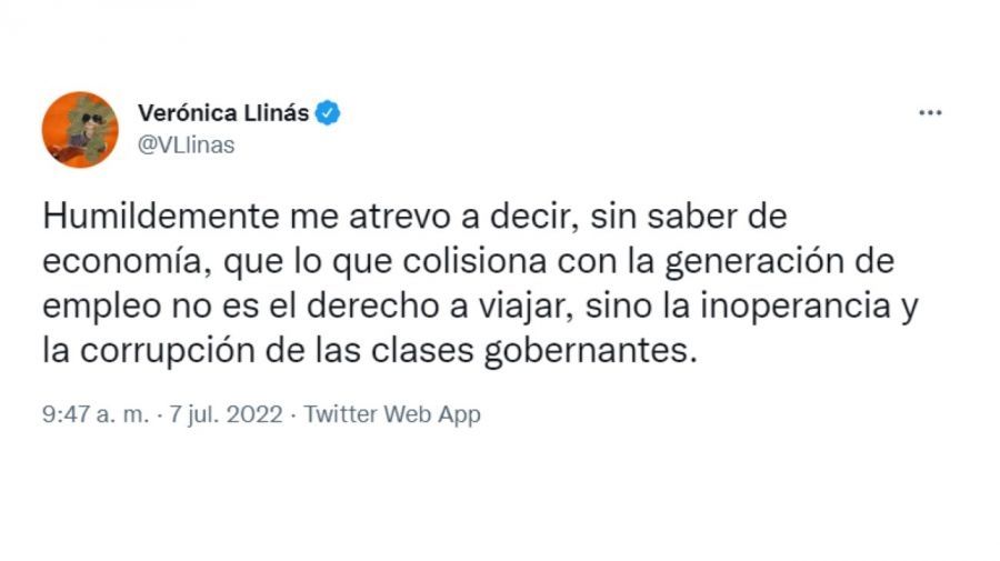 Tras la polémica por los dichos de la funcionaria, Verónica Llinás intepeló categórica a través de un mensaje de Twitter: "Humildemente me atrevo a decir, sin saber de economía, que lo que colisiona con la generación de empleo no es el derecho a viajar, sino la inoperancia y la corrupción de las clases gobernantes".