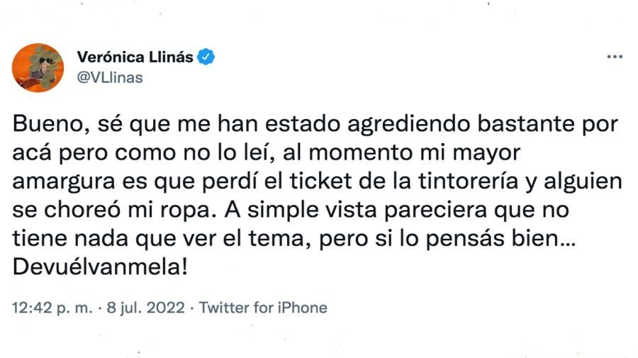Y ahora, luego de la turbulencia por su concepto sobre las expresiones de Silvina Batakis, Verónica Llinás denunció que sufrió un robo. “Bueno, sé que me han estado agrediendo bastante por acá. Pero como no lo leí, al momento mi mayor amargura es que perdí el ticket de la tintorería y alguien se choreó mi ropa", comenzó la actriz.