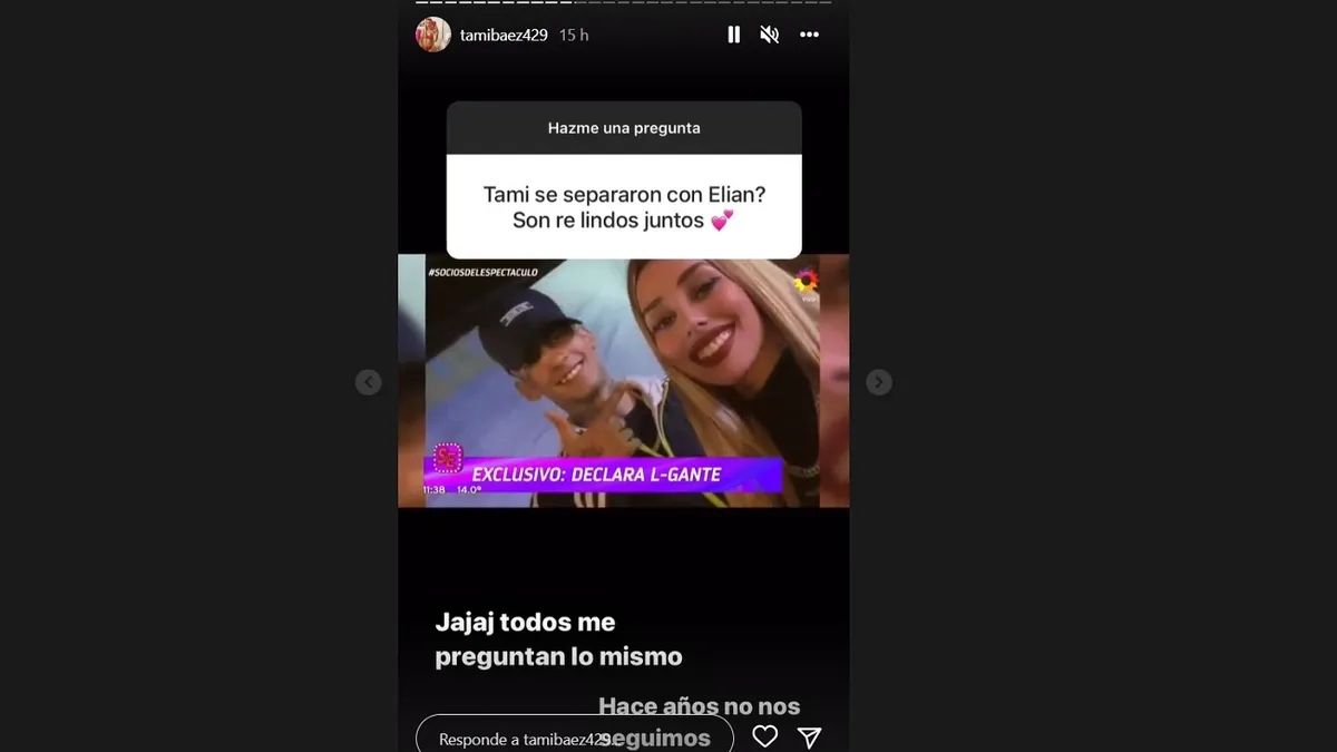 En una historia de Instagram en la que una usuaria preguntó: “Tami, ¿se separaron con Elian? Son re lindos juntos”. Ella respondió en relación al hecho de que no se siguen en la red: “Jajaja Todos me preguntan los mismo. Hace años no nos seguimos”.