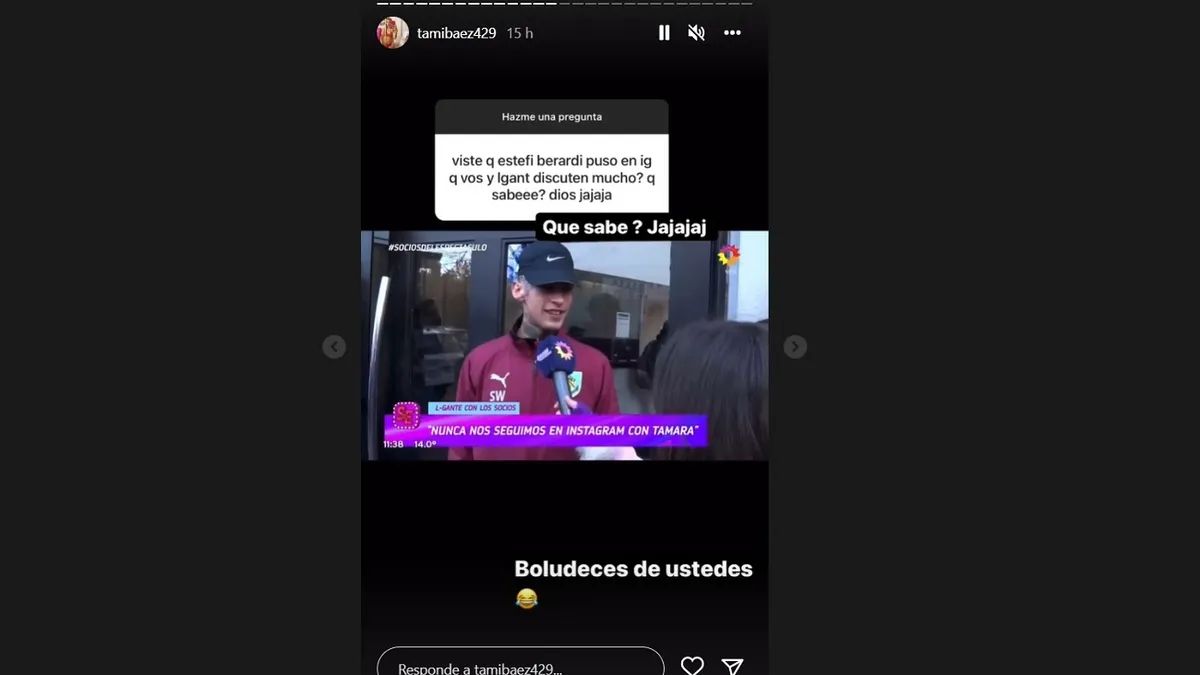 Por otro lado, una seguidora cuestionó las versiones de Estefi Berardi sobre unas presuntas peleas entre Tamara Báez y L-Gante. “¿Viste que Estefi Berardi puso en Instagram que vos y L-Gante discuten mucho?”. A lo que la joven contestó: “¿Qué sabe? Jajaja Boludeces de ustedes”.