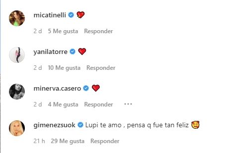 Como era de esperarse, el posteo se colmó de comentarios. Pero sin dudas el que más se destacó fue el de su abuela. "Lupi te amo, pensá que fue tan feliz", le escribió la diva en las redes sociales. Por su parte, Lucía también recibió el apoyo de varios famosos, como Mica Tinelli, Patricio Giménez, Yanina Latorre y Floppy Tesouro, entre otros.
