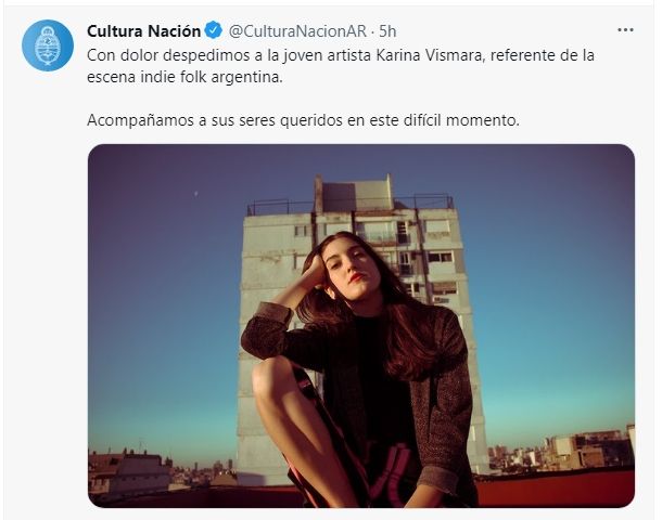 "Con dolor despedimos a la joven artista Karina Vismara, referente de la escena indie folk argentina. Acompañamos a sus seres queridos en este difícil momento", escribió en su cuenta de Twitter el Ministerio de Cultura de la Nación.