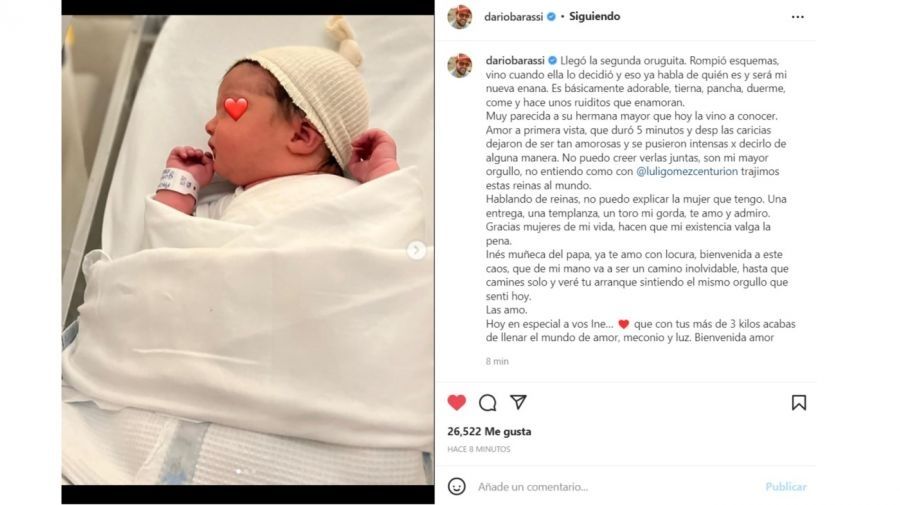 Darío Barassi subió un posteo con la imagen de Inés, pero al igual que lo hizo con su primera hija, Emilia, optó por cubrir parte de la cara de la niña con un emoji. "Llegó la segunda oruguita. Rompió esquemas, vino cuando ella lo decidió y eso ya habla de quién es y será mi nueva enana. Es básicamente adorable, tierna, pancha, duerme, come y hace unos ruiditos que enamoran", expresó el conductor.