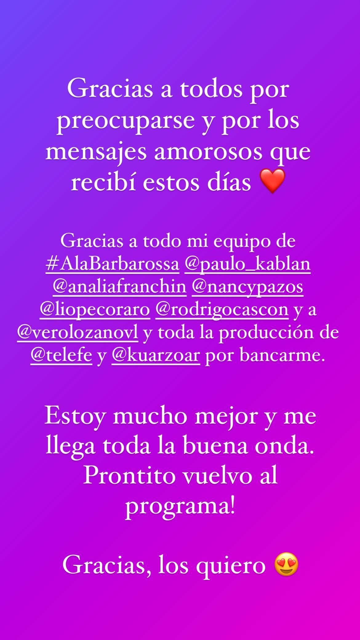 Este jueves en la noche, Barbarossa expresó desde sus historias de Instagram: “Gracias a todos por preocuparse y por los mensajes amorosos que recibí estos días. Gracias a todo mi equipo de A la Barbarossa, Kablan, Franchín, Pazos, Pecoraro, Rodrigo Cascón, y a Verónica Lozano, y a toda la producción de Telefe y Kuarzo por bancarme”.