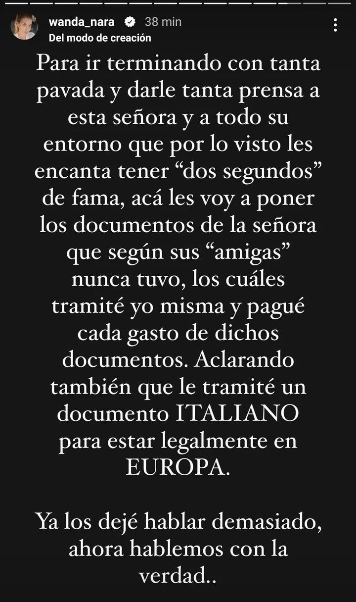 "Ya los dejé hablar demasiado, ahora hablemos con la verdad...", lanzó Wanda, aclarando que también le tramitó el documento italiano para que su ex empleada pueda estar en Milán, lugar donde trabajaba para la familia y buscando desmentir la versión de que la señora se encontraba allí de manera ilegal.