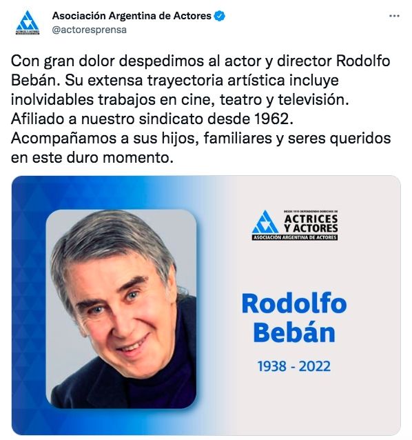 "Con gran dolor despedimos al actor y director Rodolfo Bebán. Su extensa trayectoria artística incluye inolvidables trabajos en cine, teatro y televisión. Afiliado a nuestro sindicato desde 1962. Acompañamos a sus hijos, familiares y seres queridos en este duro momento", expresaron desde su cuenta de Twitter.