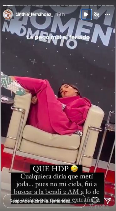 Ante las repercusiones de la imagen, Cinthia compartió el video y se lo tomó con humor. "Qué HDP. Cualquiera diría que metí joda… Pues no mi ciela, fui a buscar a la bendi a las 2 AM a lo de su amiga porque me extrañaba. Rota", expresó sobre los motivos que la llevaron a tomar un pequeño descanso durante un corte comercial.