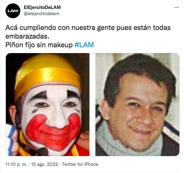 En medio del escándalo familiar que atraviesa Piñón Fijo, luego que sus hijos y su ex mujer salieran a denunciar maltratos y humillaciones, en las últimas horas se abrió un nuevo capítulo en este enfrentamiento.La cuenta de Twitter de LAM (América), el programa que conduce Ángel de Brito, filtró una foto del que sería su rostro sin maquillaje del payaso.