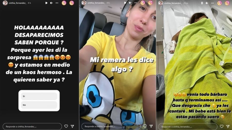 "Holaaaaa. Desaparecimos. ¿Saben por qué? Porque ayer les di la sorpresa y estamos en medio de un caos hermoso. ¿La quieren saber ya? ¿Mi remera les dice algo?. Venía todo bárbaro hasta que terminamos así... Qué desgracia che. Ya les contaré. Mi bebé está bien, le están pasando suero", contó.
